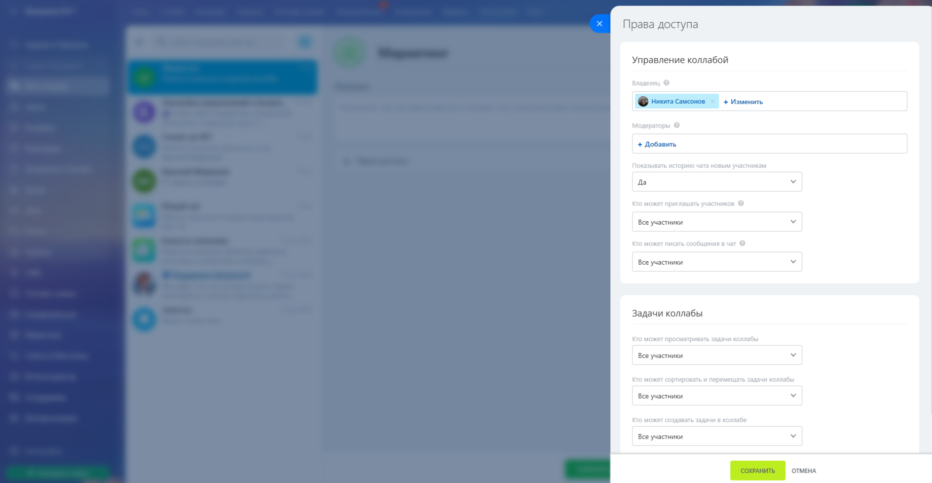 Права в коллабе делятся на два блока: управление коллабой и работа с задачами. В первом вы определяете, кто может менять настройки, приглашать участников и писать в чат. Полный доступ получает владелец — он управляет коллабой и может назначать модераторов. Модераторы помогают вести коллабу, если у них есть нужные права. Здесь же можно настроить, будет ли доступна история чата для новых участников, кто может приглашать в коллабу и кто может писать в чат — все участники или только ответственные.