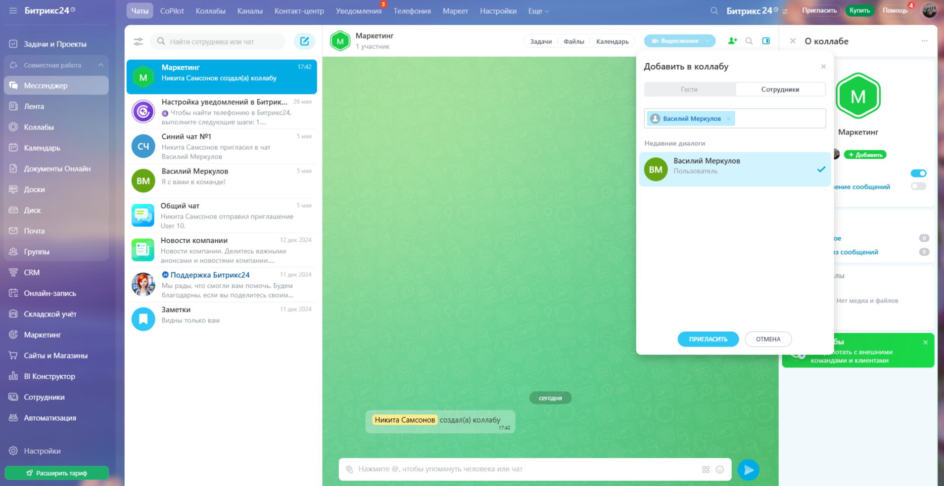 В коллабу можно пригласить как сотрудников компании, так и внешних пользователей — подрядчиков или клиентов. Чтобы добавить сотрудника, откройте сайдбар коллабы, нажмите «Добавить», перейдите на вкладку «Сотрудники», выберите нужного человека и нажмите «Пригласить».