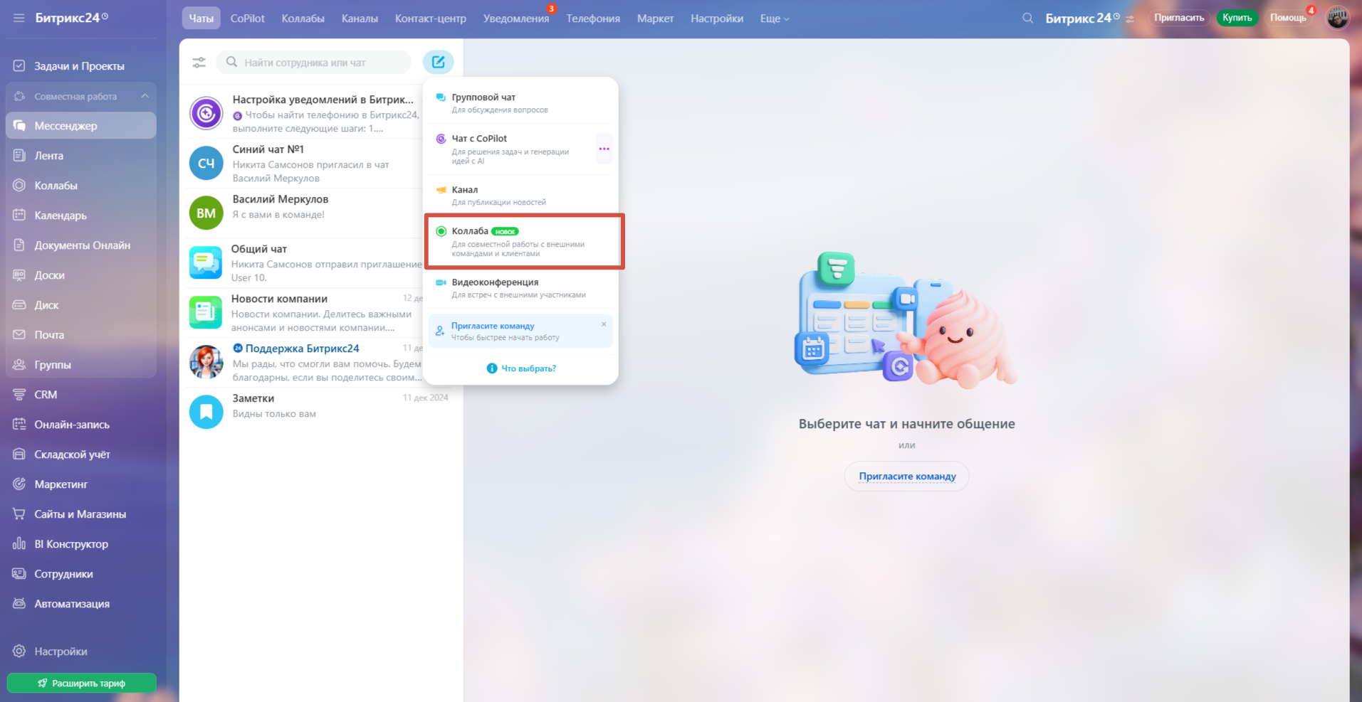 • Нажмите кнопку добавить чат и выберите Коллаба.