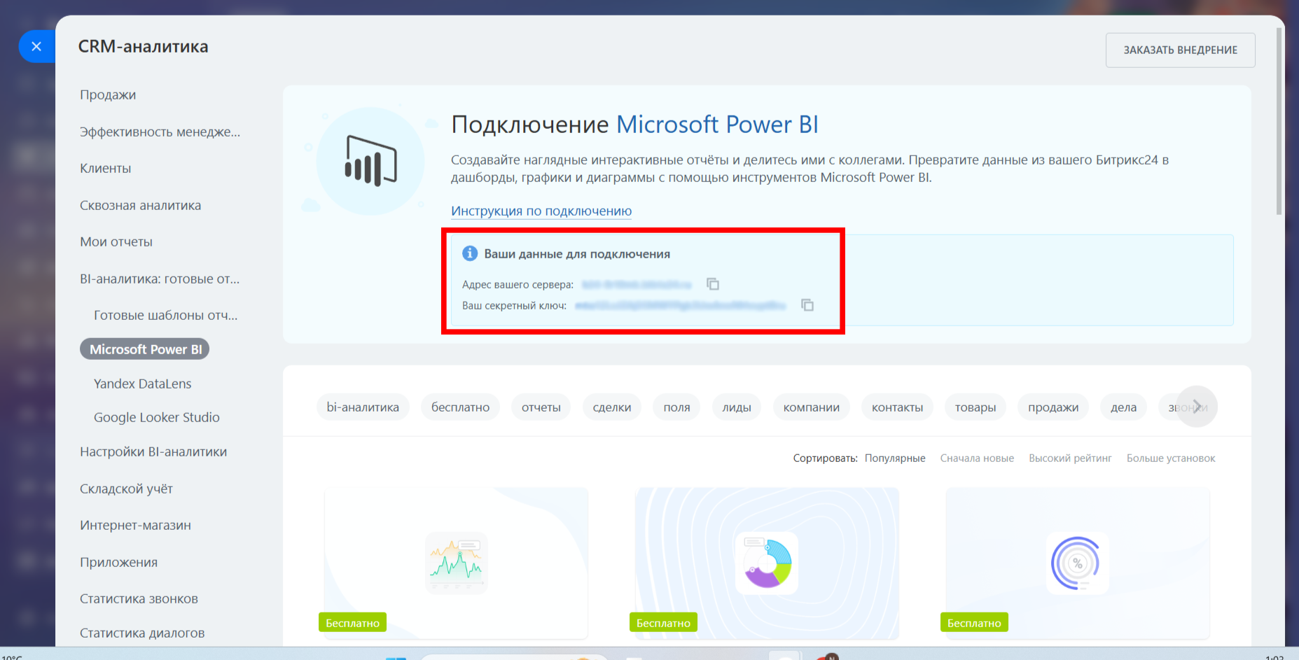 Дальше перейдите во вкладку Microsoft Power BI. Там вы увидите данные для подключения — адрес сервера, секретный ключ и другие параметры.