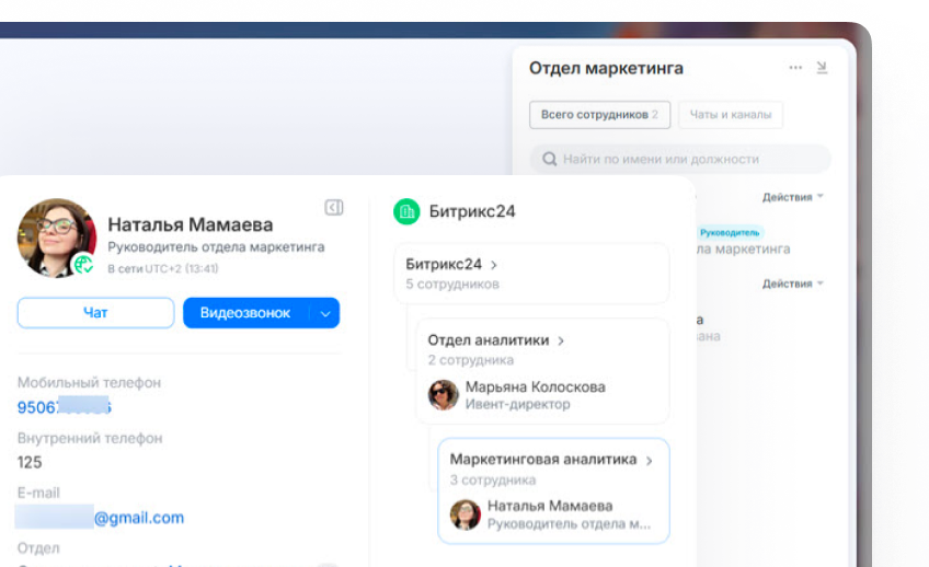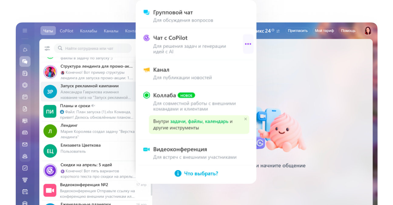 Для общения не нужны другие приложения — в Битрикс24 уже есть групповые чаты, каналы и видеозвонки. Можно быстро написать коллеге, созвониться или поделиться файлом. А ещё прямо из чата легко поставить задачу или запланировать встречу.