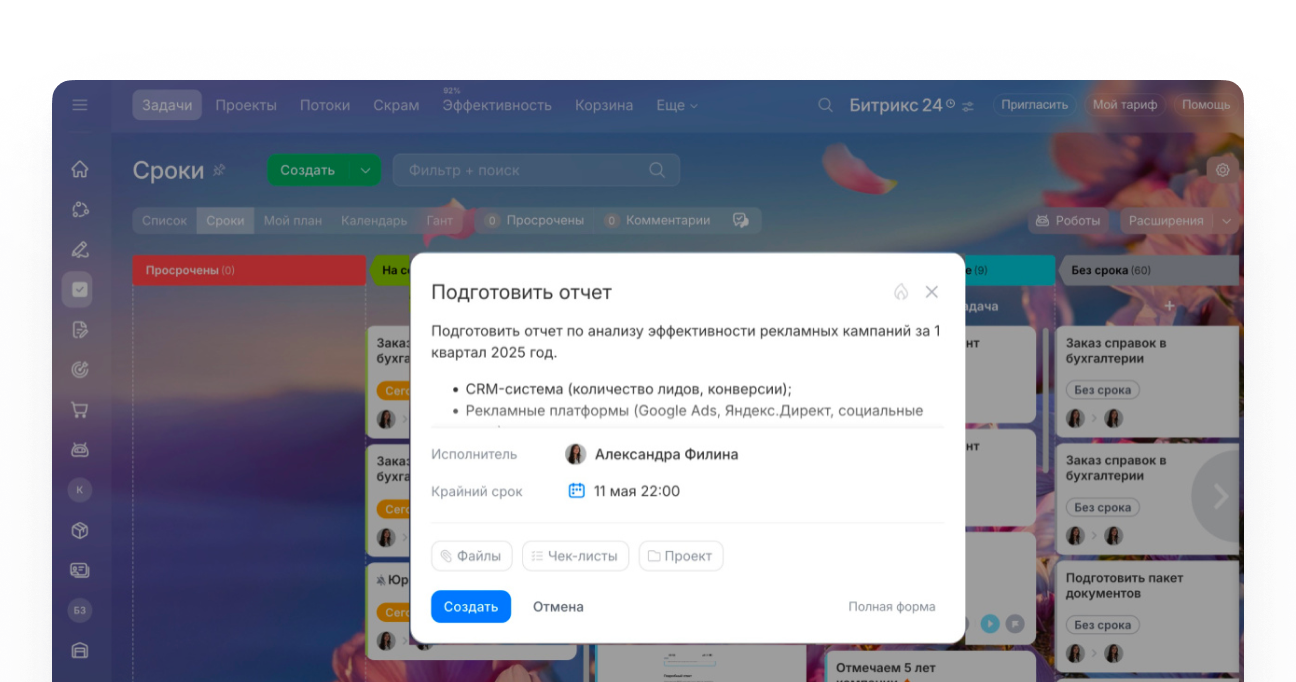 В Битрикс24 легко собирать и строить отчеты. BI-конструктор собирает данные из CRM, задач, звонков и других разделов вашего портала. Можно анализировать ключевые показатели бизнеса, эффективность сотрудников, динамику лидогенерации и многое другое.