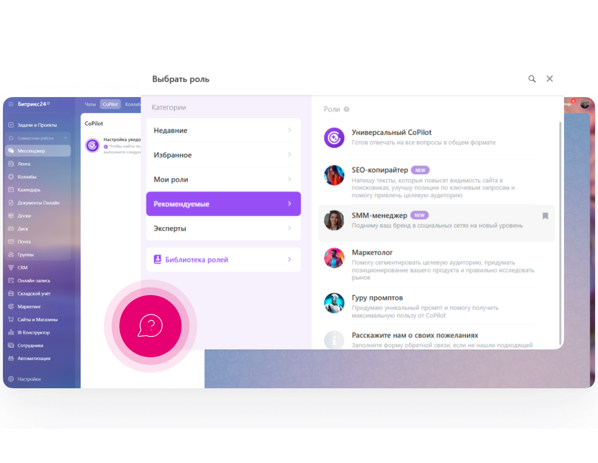 CoPilot встроен во многие инструменты Битрикс24 и помогает работать эффективнее в чатах, CRM, проектах, на встречах.