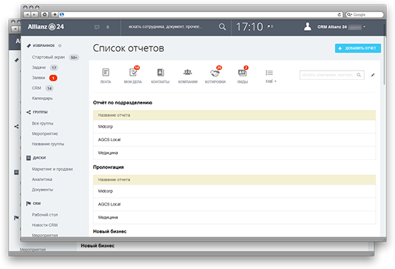 Отчеты строятся с учетом служебных доступов сотрудников: рядовому менеджеру доступны только его сделки, начальник получает сведения о клиентах и сделках подчиненных.