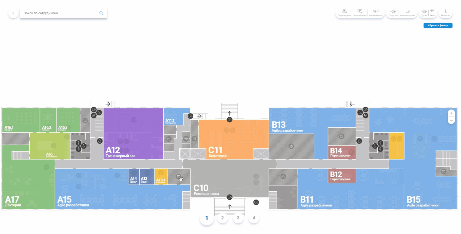 Например, если раньше менеджеру нужно было искать другого сотрудника, чтобы подписать документ, то теперь он может открыть карту офиса и точно посмотреть, где и как его найти.