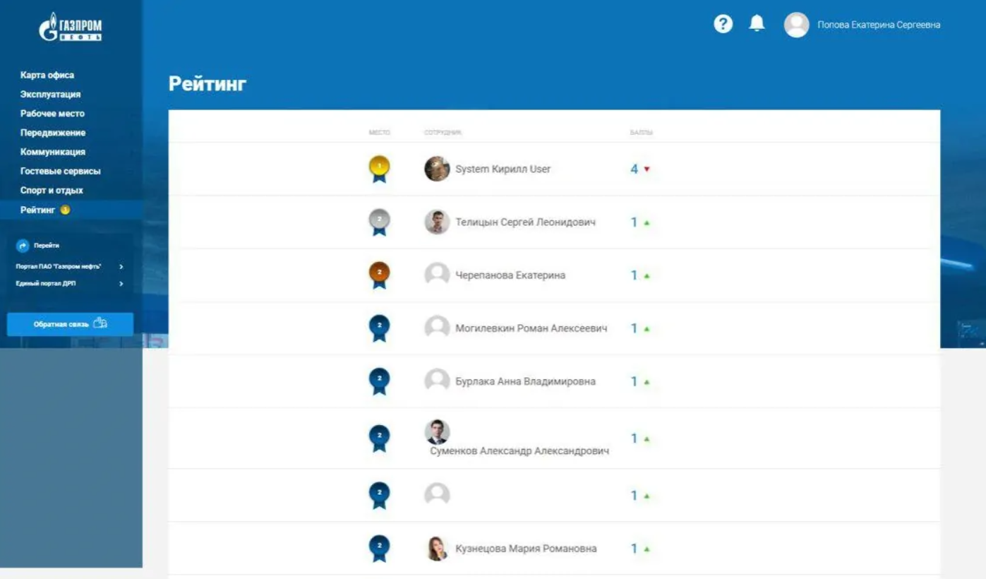 Дашборд – рейтинг активности сотрудников компании, использующих сервисы. За счет этого функционала повышается их вовлеченность в использование автоматизированных сервисов, которые, в свою очередь, повышают продуктивность их работы.