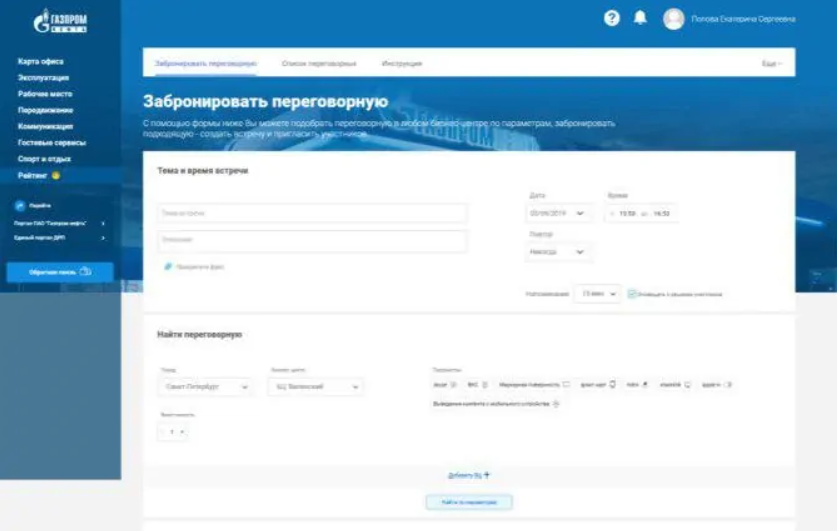 • Упрощен процесс подбора и бронирования переговорных комнат, заказа дополнительных услуг для организации совещаний.